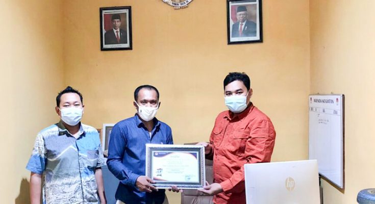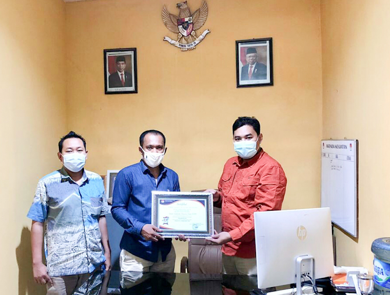 Komisioner Devisi SDM dan Parmas KPU Gresik Makmun memberikan sertifikat akreditasi kepada Ketua KIPP Bachtiar Rifa’e