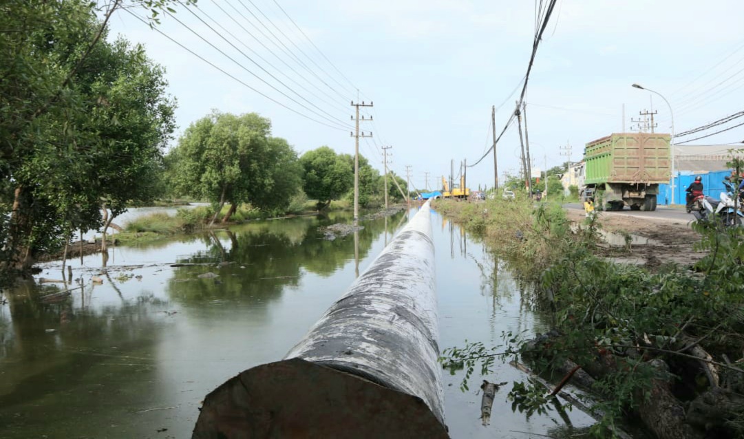 Dalam pengamatan 1minute.id sejumlah pekerja pemasangan pipa berdiameter 1.100 milimeter atau 1,1 meter di sekitar Desa Banyuwangi, Kecamatan Manyar, Gresik. Proyek sistem penyediaan air minum (SPAM) semula ditargetkan kelar 2021.