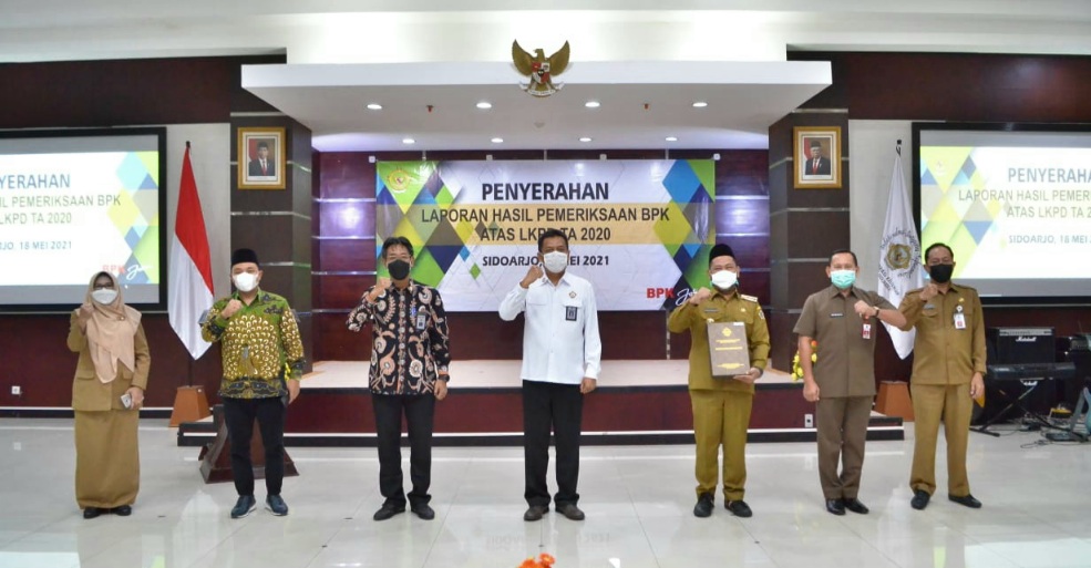 Bupati Gresik Fandi Akhmad Yani menerima buku laporan tersebut dari Kepala BPK Perwakilan Jawa Timur Joko Agus Setyono di Kantor BPK Perwakilan Jawa Timur di Sidoarjo pada Selasa, 18 Mei 2021.