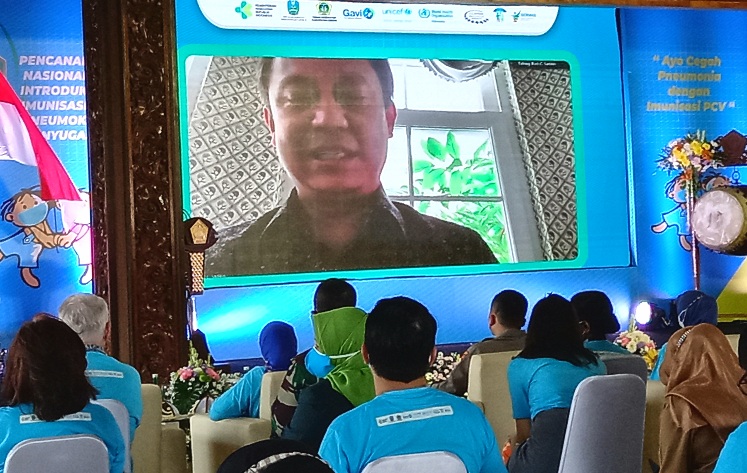 VIRTUAL : Menteri Kesehatan Budi Gunadi Sadikin memberikan sambutan virtual pencanangan imunisasi PCV pada Selasa, 22 Juni 2021 ( foto : chusnul cahyadi/1minute.id)