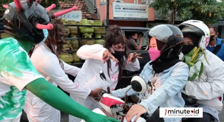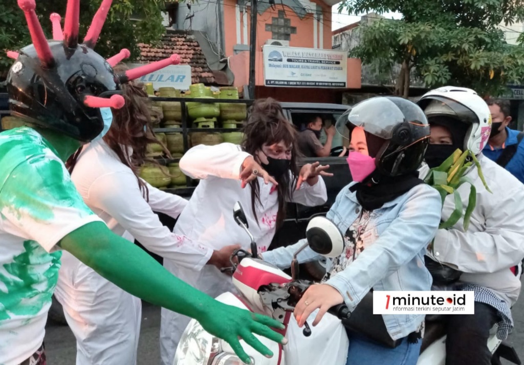 Teatrikal yang dilakukan oleh petugas dengan membawa manekin yang dibungkus kain kafan serta mayat hidup (polisi berkostum mayat) dan manusia corona membuat pengendara terutama perempuan bergidik. “Kaget…! Semoga corona berakhir,”ucap Rahma, pengendara motor.
