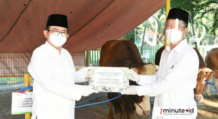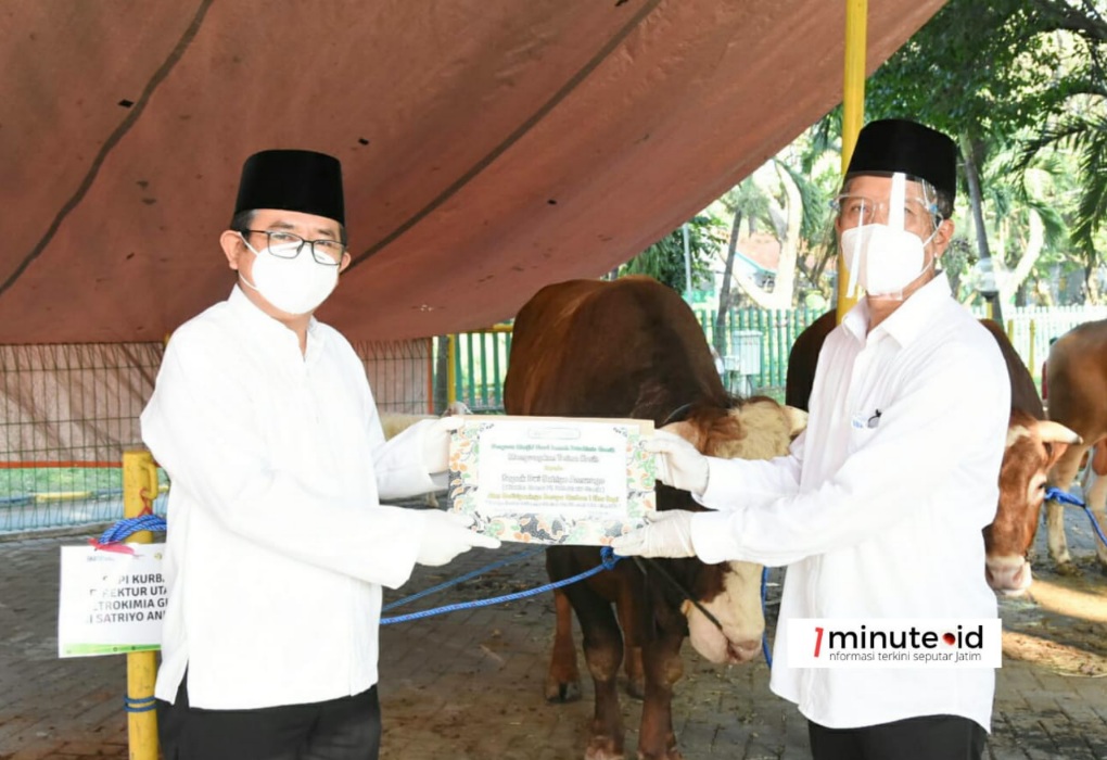 Hewan kurban senilai Rp 682 juta diserahkan secara simbolis oleh Direktur Utama Petrokimia Gresik Dwi Satriyo Annurogo kepada Ketua Takmir Masjid Nurul Jannah Rohmad.