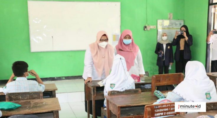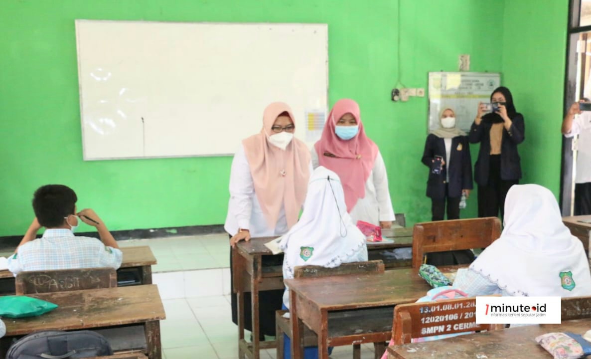 GRESIK,1minute.id – Wakil Bupati Gresik Aminatun Habibah mengunjungi SMP Negeri 24 Gresik. Kedatangan Bu Min-sapaan-Aminatun Habibah untuk memantau pembelajaran tatap muka (PTM) di sekolah berlokasi di Desa Dungus, Kecamatan Cerme, Gresik.