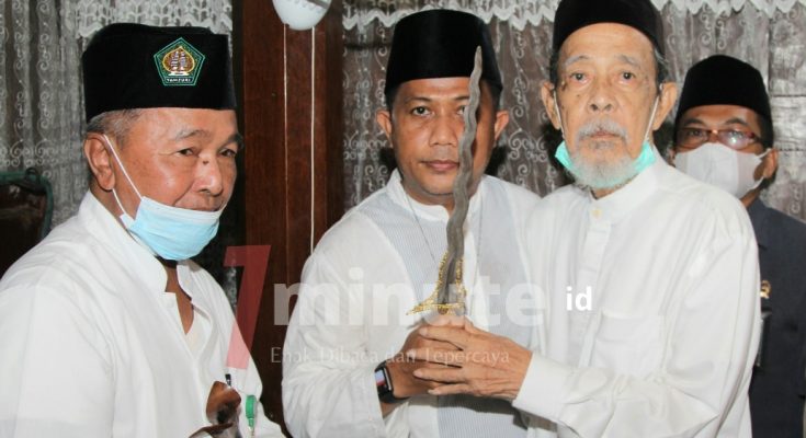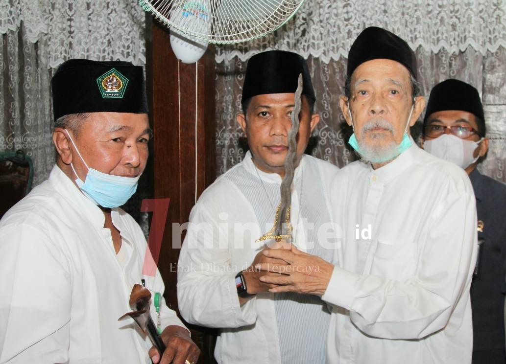 WAFAT : KH Muchtar Djamil (kanan) bersama santrinya, Muhammad Tajuddin memegang keris peninggalan Sunan Giri pada Selasa, 8 Maret 2022 (Foto: Chusnul Cahyadi/1minute.id)