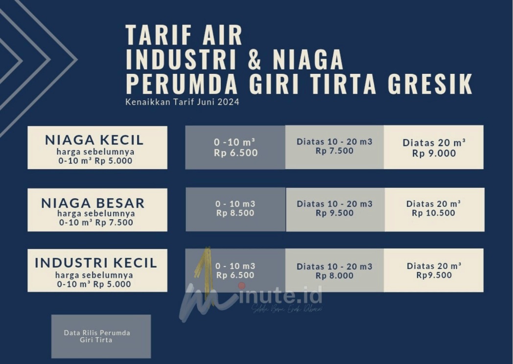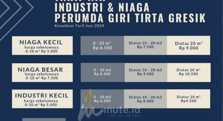 GRESIK,1minute.id – Perusahaan Daerah Air Minum (Perumda) Giri Tirta Gresik mengumumkan adanya penyesuaian tarif air yang berlaku mulai pemakaian air bulan Mei 2024 yang ditagihkan di bulan Juni 2024.