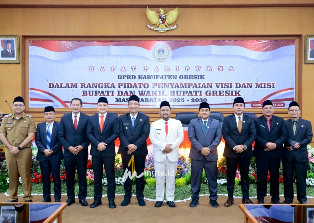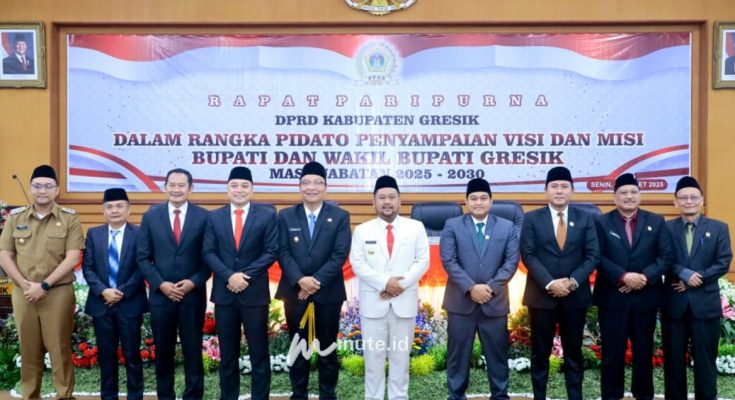 GRESIK,1minute.id – Bupati dan Wakil Bupati Gresik, Fandi Akhmad Yani-Asluchul Alif memaparkan visi dan misi masa jabatan 2025-2030 dalam Rapat Paripurna yang digelar di Ruang Paripurna Gedung DPRD Gresik pada Senin, 3 Maret 2025.