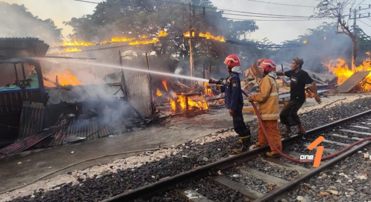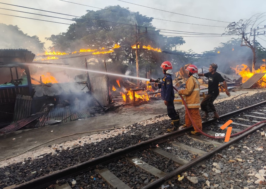 Upaya petugas damkar melakukan pemadaman sempat terhenti sekitar 7 menit karena kereta api jurusan ke Stasiun Indro, Gresik lewat. Di sepanjang Jalan Kapten Darmo Sugondo ini atau dekat rel kereta api banyak bangunan semi permanen berdiri. Sebagian besar, bangunan itu untuk warung kopi atau kafe. (yad)