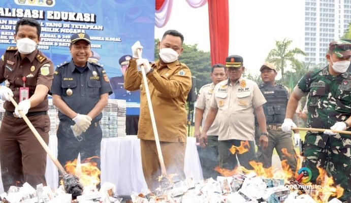 GRESIK,1minute.id – Sebanyak 9,86 juta batang rokok dan 349,2 liter Minuman Mengandung Etil Alkohol (MMEA) dimusnahkan di kantor Bupati Gresik pada Selasa, 9 Desember 2025. Bupati Gresik Fandi Akhmad Yani yang memimpin langsung pemusnahan barang ilegal yang berpotensi mengakibatkan kerugian negara mencapai Rp 9,63 miliar itu.