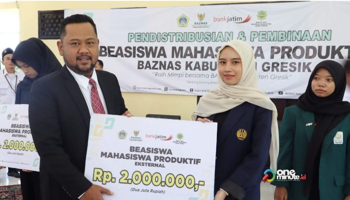 GRESIK,1minute.id – Bupati Gresik Fandi Akhmad Yani menyalurkan beasiswa pendidikan Badan Amil Zakat Nasional (Baznas) bagi mahasiswa kurang mampu. Penyaluran beasiswa oleh Bupati dilakukan secara simbolis saat membuka kegiatan Pendistribusian dan Pembinaan Beasiswa Mahasiswa Produktif Baznas Gresik 2025 pada Rabu, 17 Desember 2025.