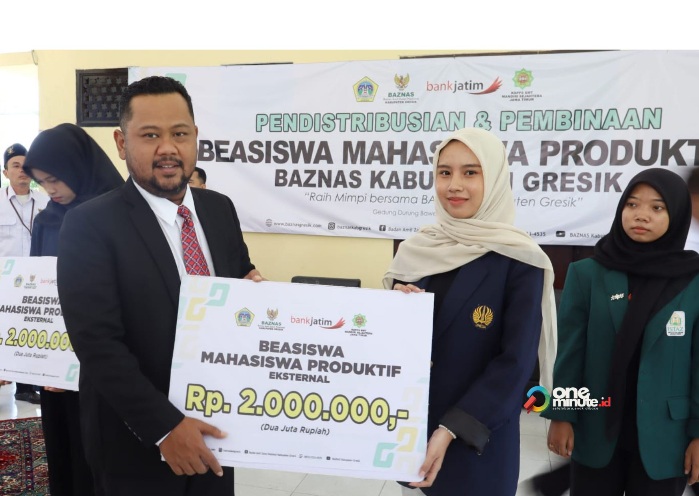 GRESIK,1minute.id – Bupati Gresik Fandi Akhmad Yani menyalurkan beasiswa pendidikan Badan Amil Zakat Nasional (Baznas) bagi mahasiswa kurang mampu. Penyaluran beasiswa oleh Bupati dilakukan secara simbolis saat membuka kegiatan Pendistribusian dan Pembinaan Beasiswa Mahasiswa Produktif Baznas Gresik 2025 pada Rabu, 17 Desember 2025.