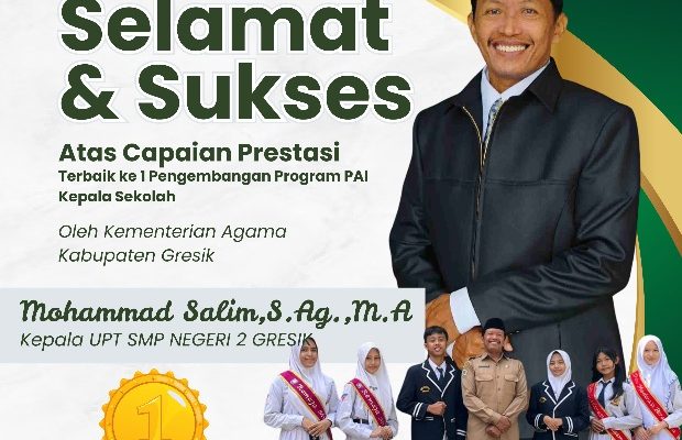 GRESIK,1minute.id – Menjelang akhir tahun 2025, civitas UPT SMP Negeri 2 (Spenda) Gresik mendapatkan kado istimewa dari Kementerian Agama (Kemenag) Gresik. Mohammad Salim dinobatkan sebagai Juara Pertama Kepala Sekolah Imlementator Pengembangan Pendidikan Agama Islam (PAI) 2025.