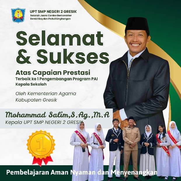 UPT SMP Negeri 2 Gresik, satu-satunya lembaga pendidikan jenjang Sekolah Menengah Pertama Negeri di Kota Santri, sebutan lain, Kabupaten Gresik. Juara kedua, diraih Sholahiyah dari Kepala SMP Alkarimi, Desa Tebuwung, Kecamatan Dukun dan juara tiga yakni Moh Ghozali, Kepala UPT SDN 296 Gresik.