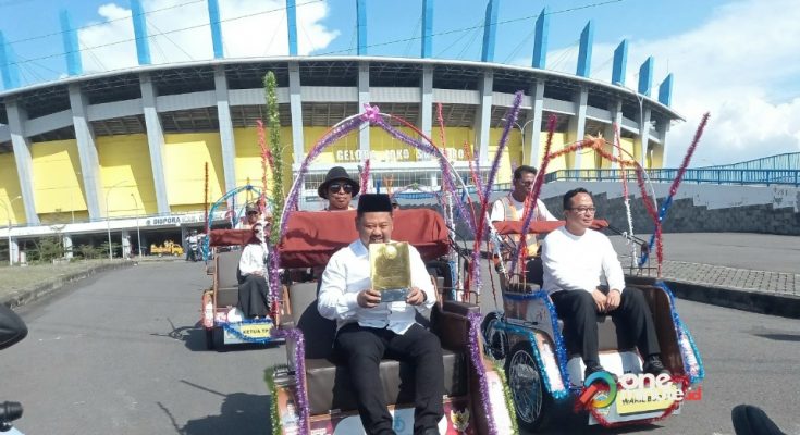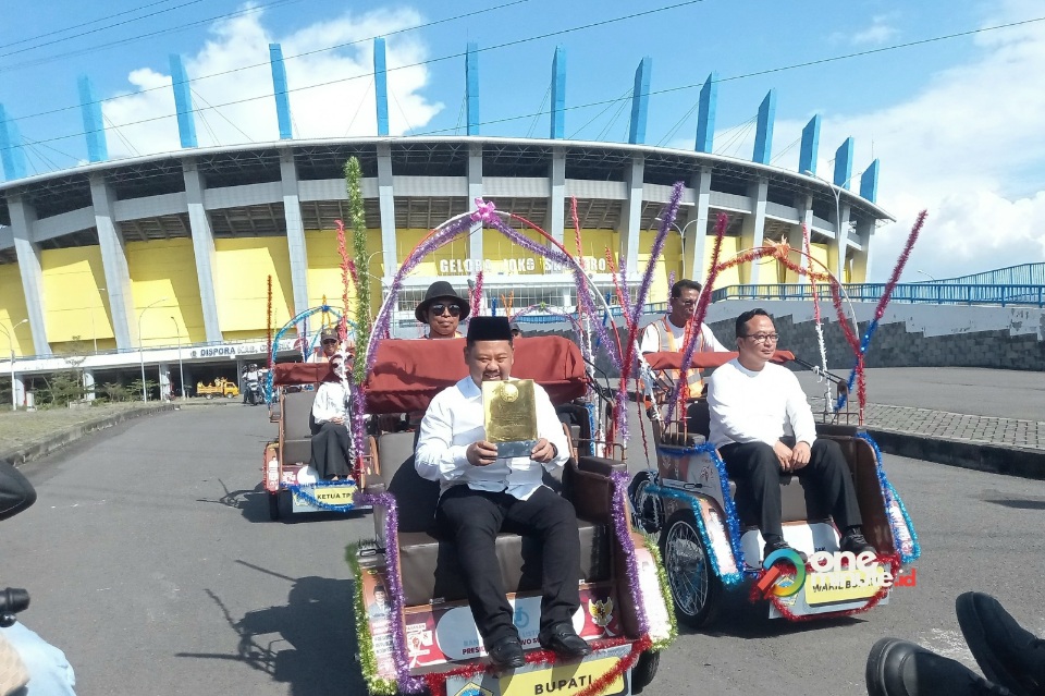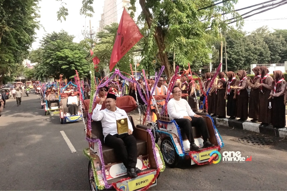 Bupati Gresik Fandi Akhmad Yani bersama Wakil Bupati Gresik Asluchul Alif serta Forkopimda diarak keliling kota dengan becak listrik, mobil listrik karya siswa SMK PGRI 1 Gresik serta kendaraan lainnya.