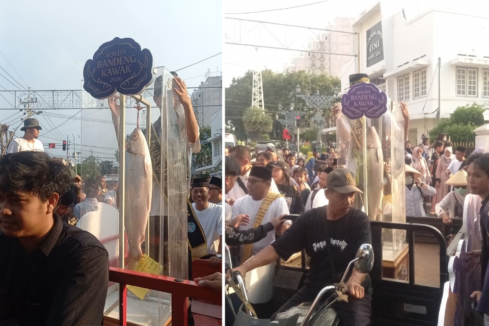 KIRAB Bandeng Kawak sebelum Kontes dan Lelang Bandeng dalam tradisi Pasar dan Kontes Bandeng Kawak di depan Gedung Nasional Indonesia pada Senin, 16 Maret 2026. Pasar dan Kontes Bandeng telah ditetapkan sebagai Warisan Budaya Tak Benda Indonesia oleh Kementerian Kebudayaan pada 2025 ( Foto: Chusnul Cahyadi/1minute.id)